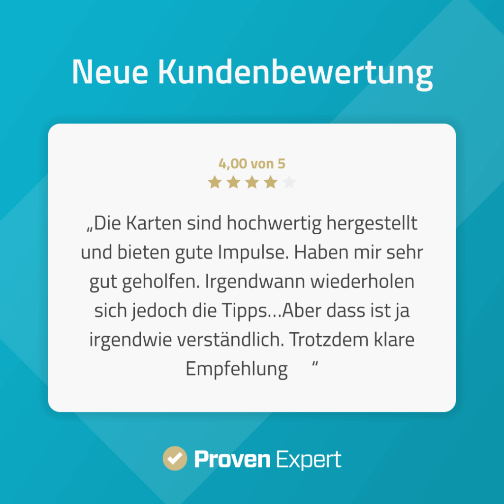 Die Karten sind hochwertig hergestellt und bieten gute Impulse. Haben mir sehr gut geholfen. Irgendwann wiederholen sich jedoch die Tipps…Aber dass ist ja irgendwie verständlich. Trotzdem klare Empfehlung 😉👍